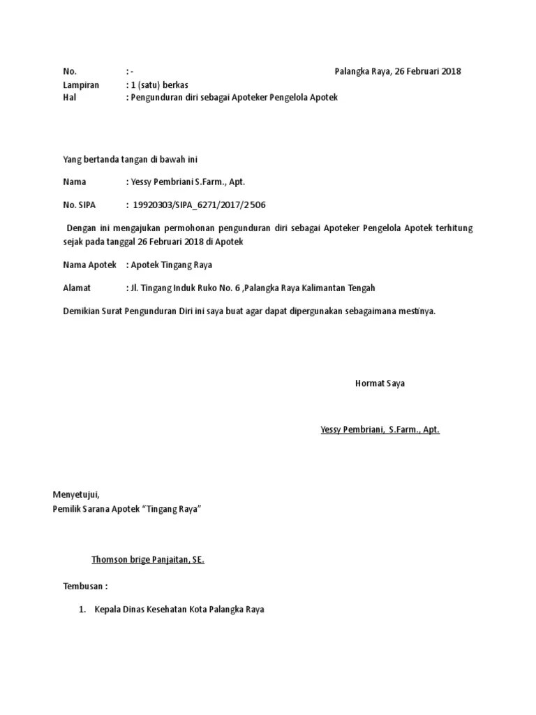 Bagi sarjana farmasi yang membutuhkan surat sumpah dapat mengajukan permohonan. Seperti resign dari perusahaan sebagai karyawan, dll. 9 asli surat pengunduran diri. Contoh surat lamaran kerja farmasi di apotek download gratis. Perawat apoteker farmasi administrasi dan lain sebagainnya. Makalah id seperti apakah contoh surat pengunduran diri guru sebenarnya surat pengunduran yang akan kami . Contoh surat resign pengunduran diri pada artikel sebelumnya kita telah. Berbagai informasi mengenai contoh surat pengunduran diri kerja di apotek. Yang bertanda tangan di bawah ini, . Contoh surat pengunduran diri dari perusahaan farmasi d fidget sner . Lihat juga contoh:surat dan contoh surat resign farmasi. Berikut daftar contoh surat pengunduran diri atau contoh surat resign yang baik dan benar yang bisa dijadikan pedoman. Ketua sekolah tinggi farmasi indonesia.