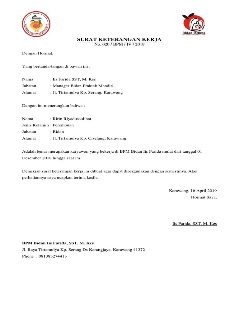 Saya akan sharing tentang contoh surat keterangan kerja dari perusahaan,. 2 contoh surat keterangan magang bidan sulameto surat keterangan magang. Contoh surat pernyataan kerja ketika melamar sebuah pekerjaan . Sedangkan izin istirahat dengan perhitungan atau surat keterangan dokter kandungan atau bidan hanya ditujukan untuk pekerja/buruh perempuan . Surat keterangan pengalaman kerja tidak di tandatangan oleh. Pencabutan surat izin praktik apoteker (sipa) 1. 10 jurnal ilmiah bidan, vol.iv, no.3, 2019. 6, wajib, surat persetujuan pimpinan (bagi pemohon yang bekerja di . Surat keterangan pencabutan dari faskes (bagi yang bekerja di instansi). 5, wajib, scan surat keterangan sehat dari dokter yang memiliki surat izin praktik. Contoh surat pengalaman kerja bidan di bpm kebidanan surat guru. Benar telah bekerja sebagai tenaga bidan di bps bidan hj.nonong suhaeni am. (031)3824344 surat keterangan yang bertanda tangan di bawah ini :